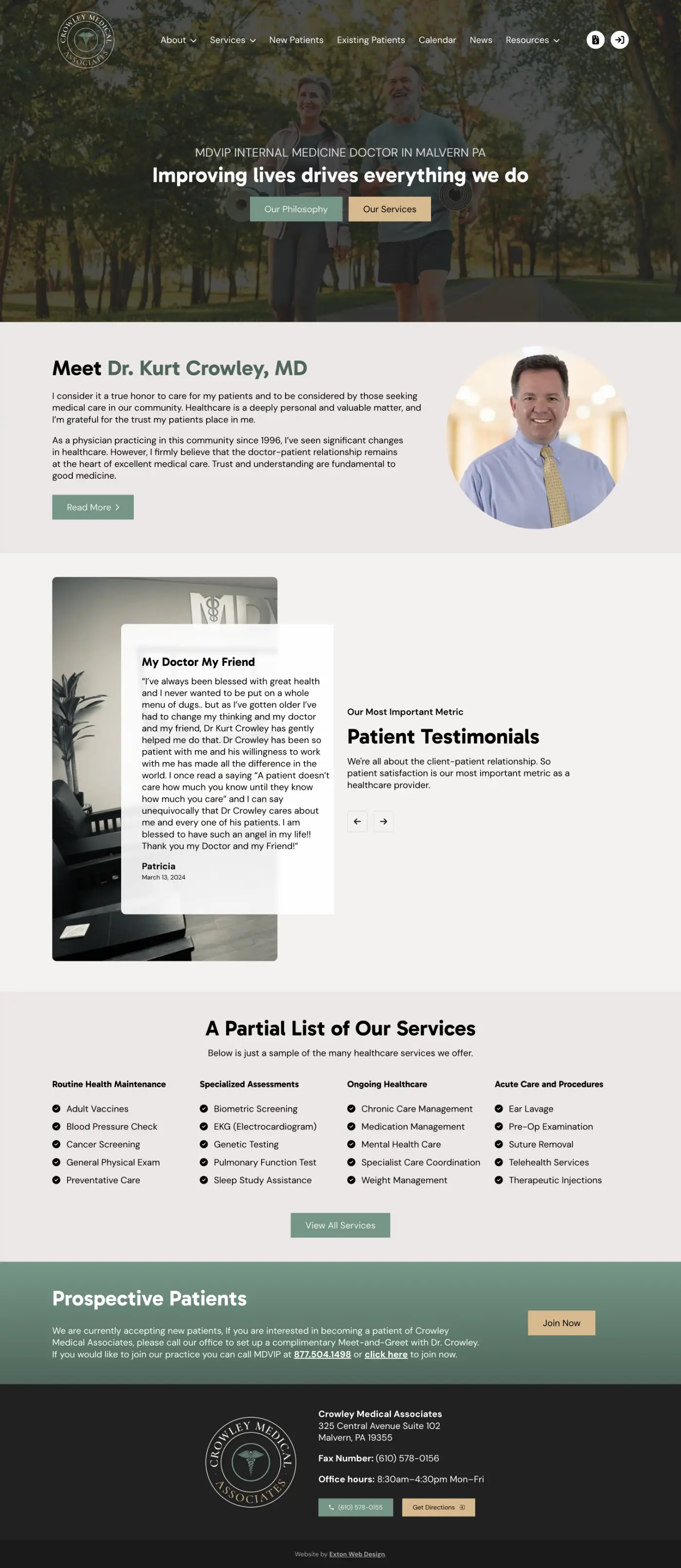 Crowley Medical Associates is a personalized healthcare practice in Malvern, PA, led by Dr. Kurt Crowley, MD, who has been serving the community since 1996. The practice is affiliated with MDVIP, a network that enables physicians to limit patient panels and provide more individualized attention. Dr. Crowley’s approach centers on building strong doctor-patient relationships through quality time, comprehensive care, and treating root causes rather than just symptoms.