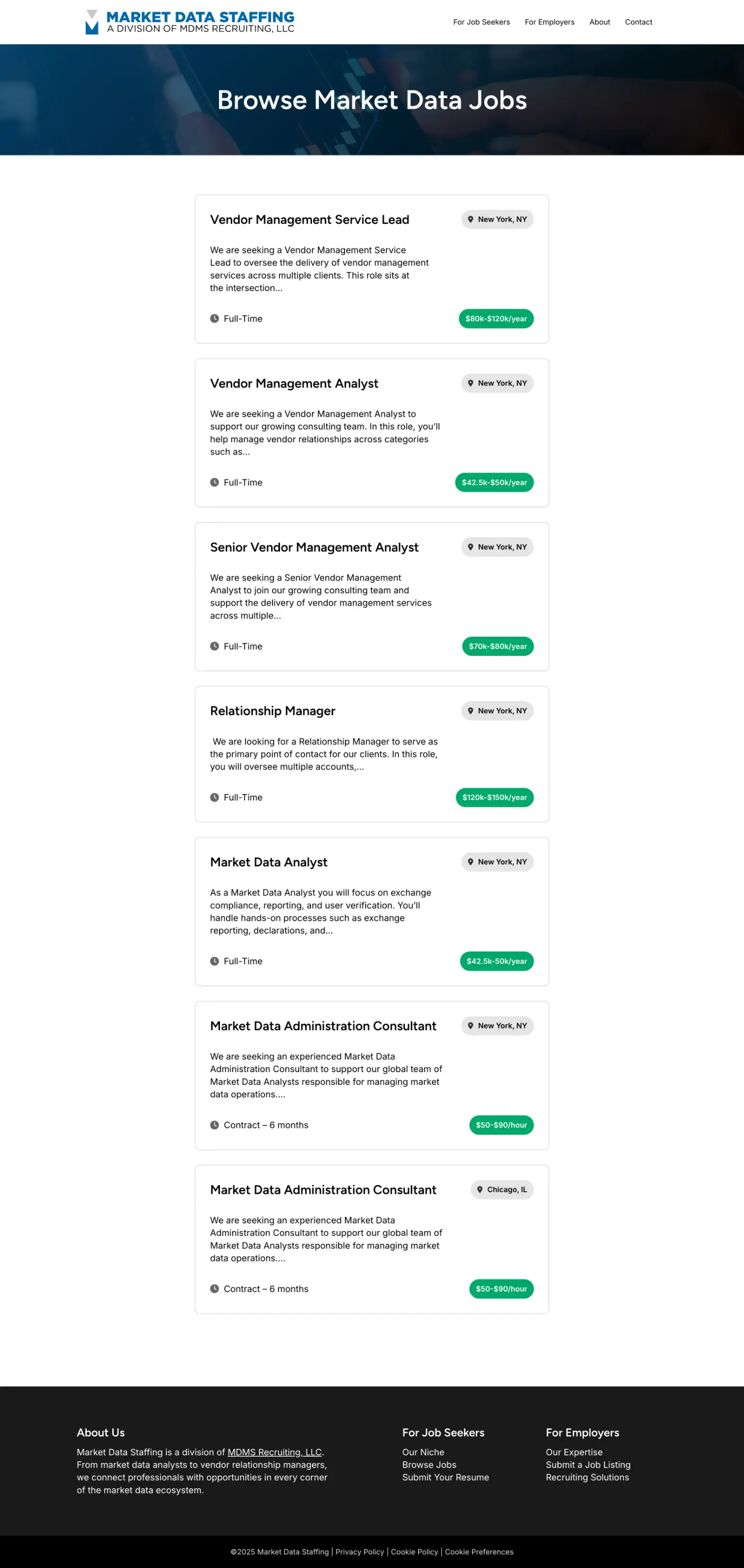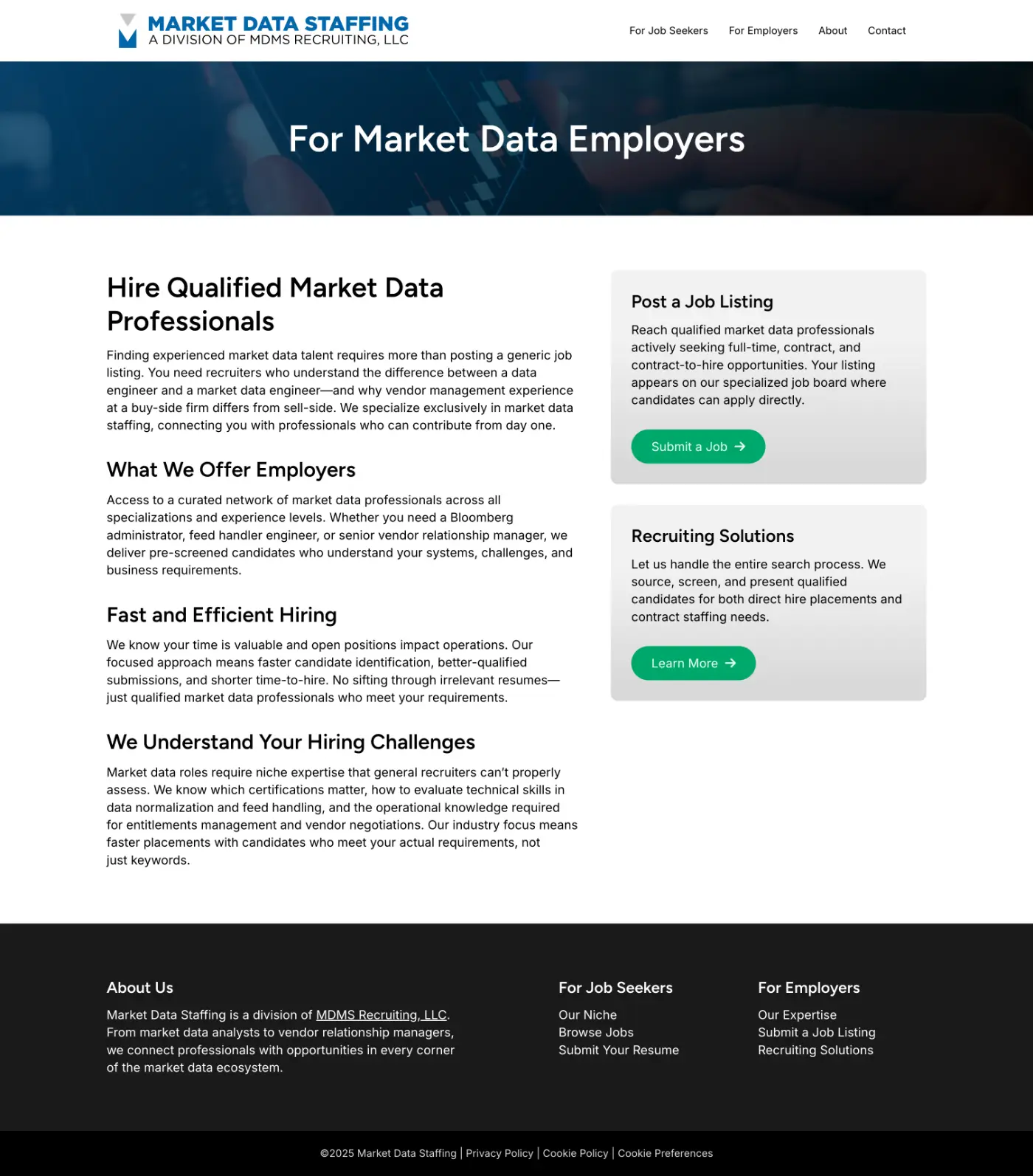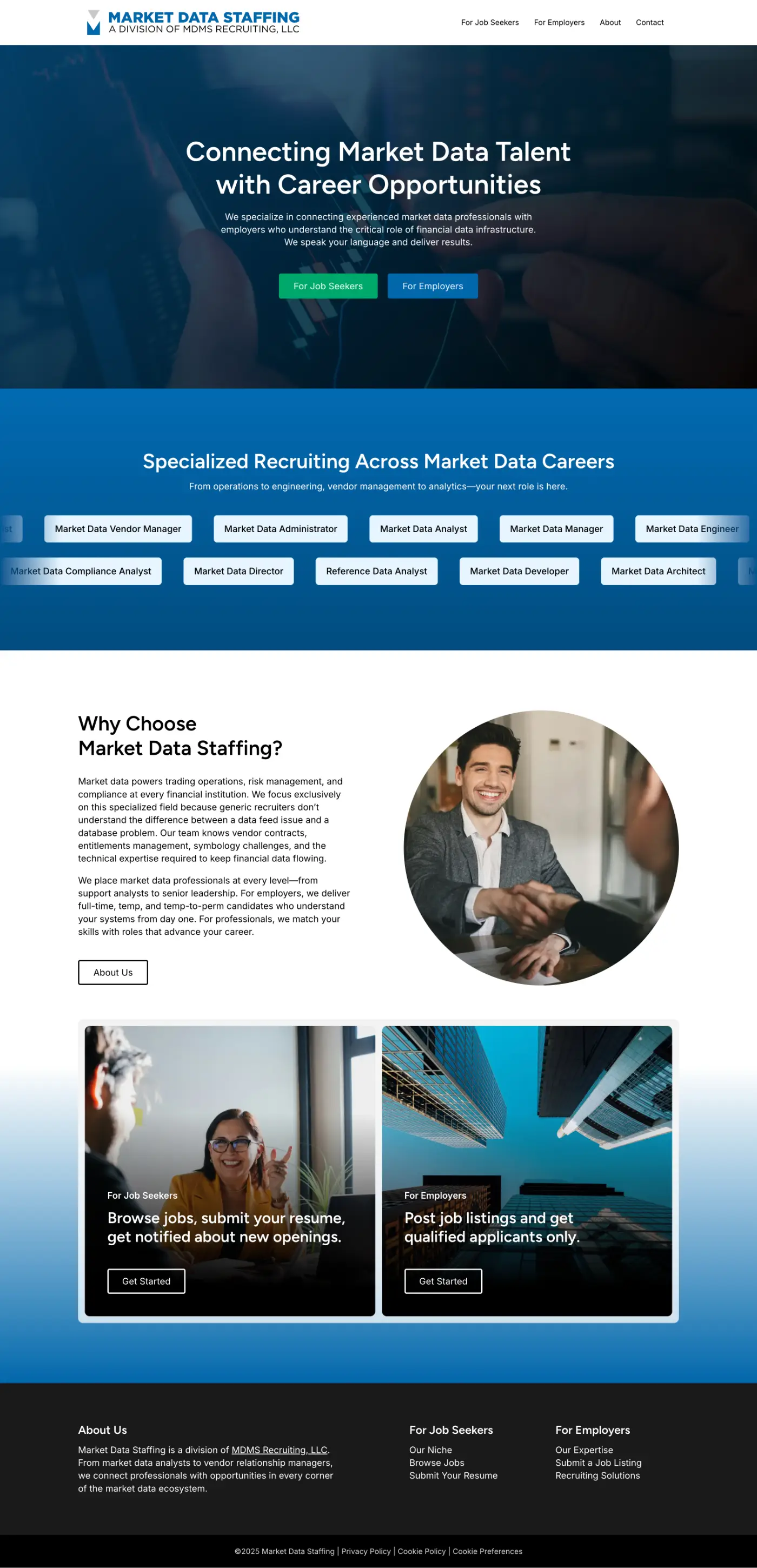 The Challenge: Market Data Staffing needed a professional web presence to establish credibility in their specialized niche and provide two distinct user paths: one for job seekers exploring market data career opportunities, and another for employers seeking qualified talent.