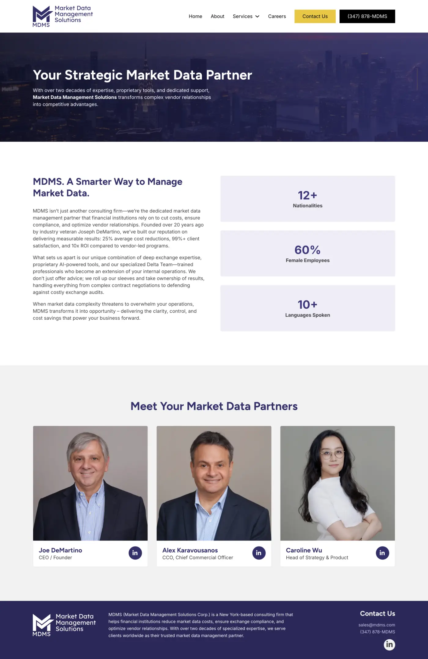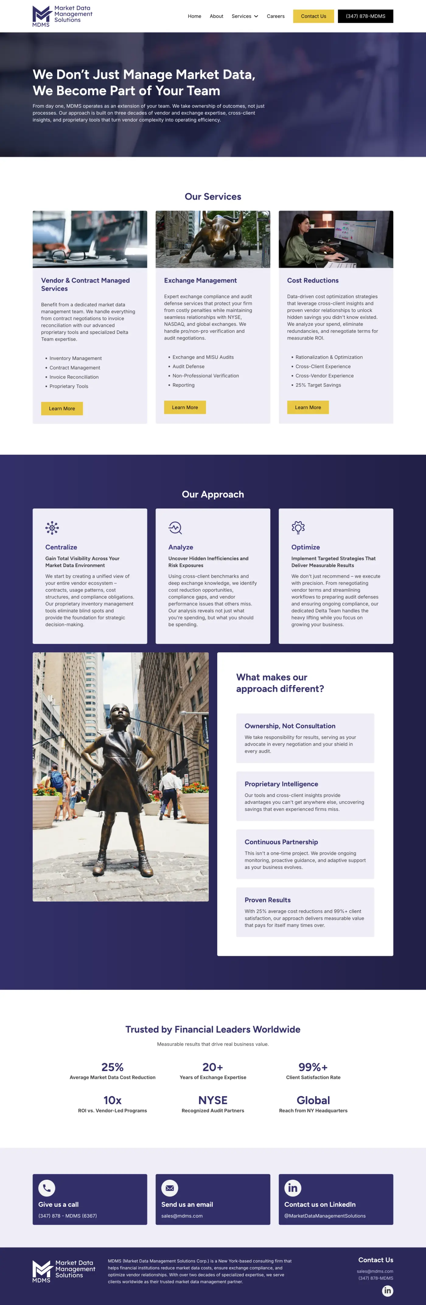 Market Data Management Solutions (MDMS) is a specialized consulting firm that helps financial institutions navigate the complex landscape of market data vendor management and exchange compliance. Founded over 20 years ago and headquartered in New York, MDMS serves clients worldwide – from hedge funds and investment banks to fintech companies – delivering an average of 25% cost reductions while maintaining 100% exchange compliance.