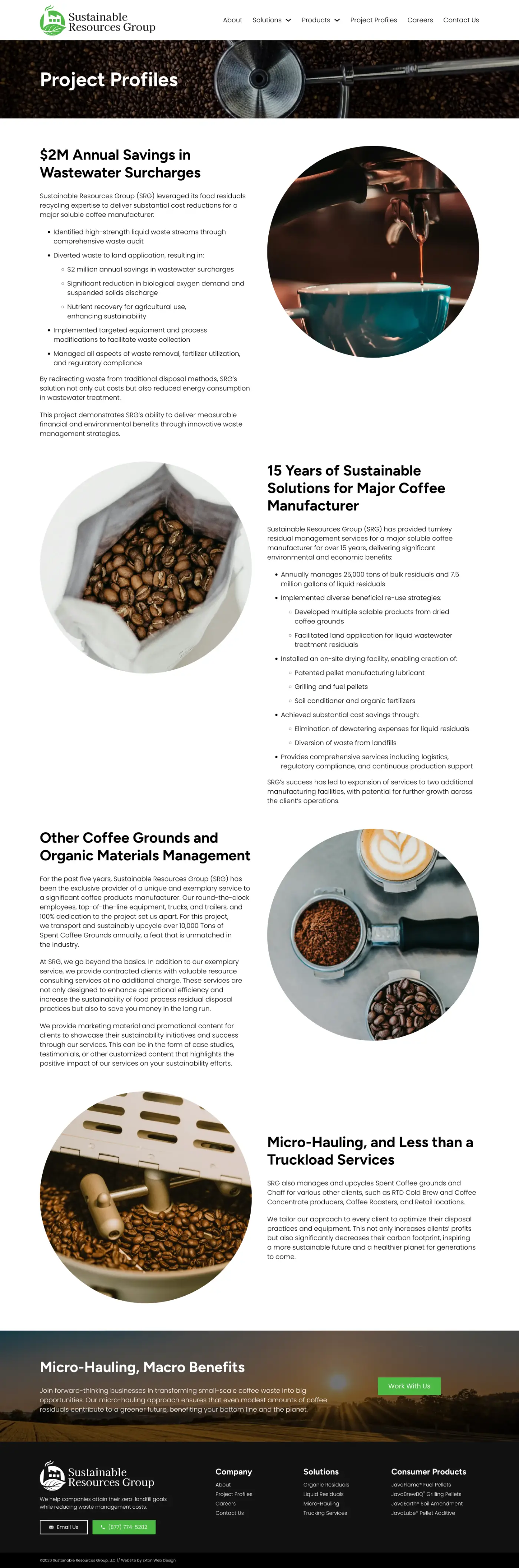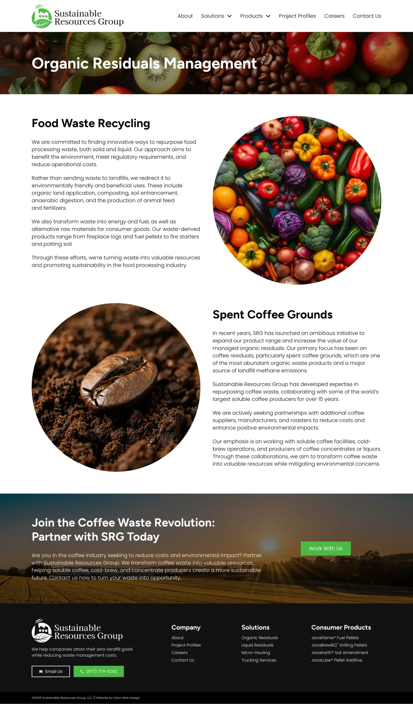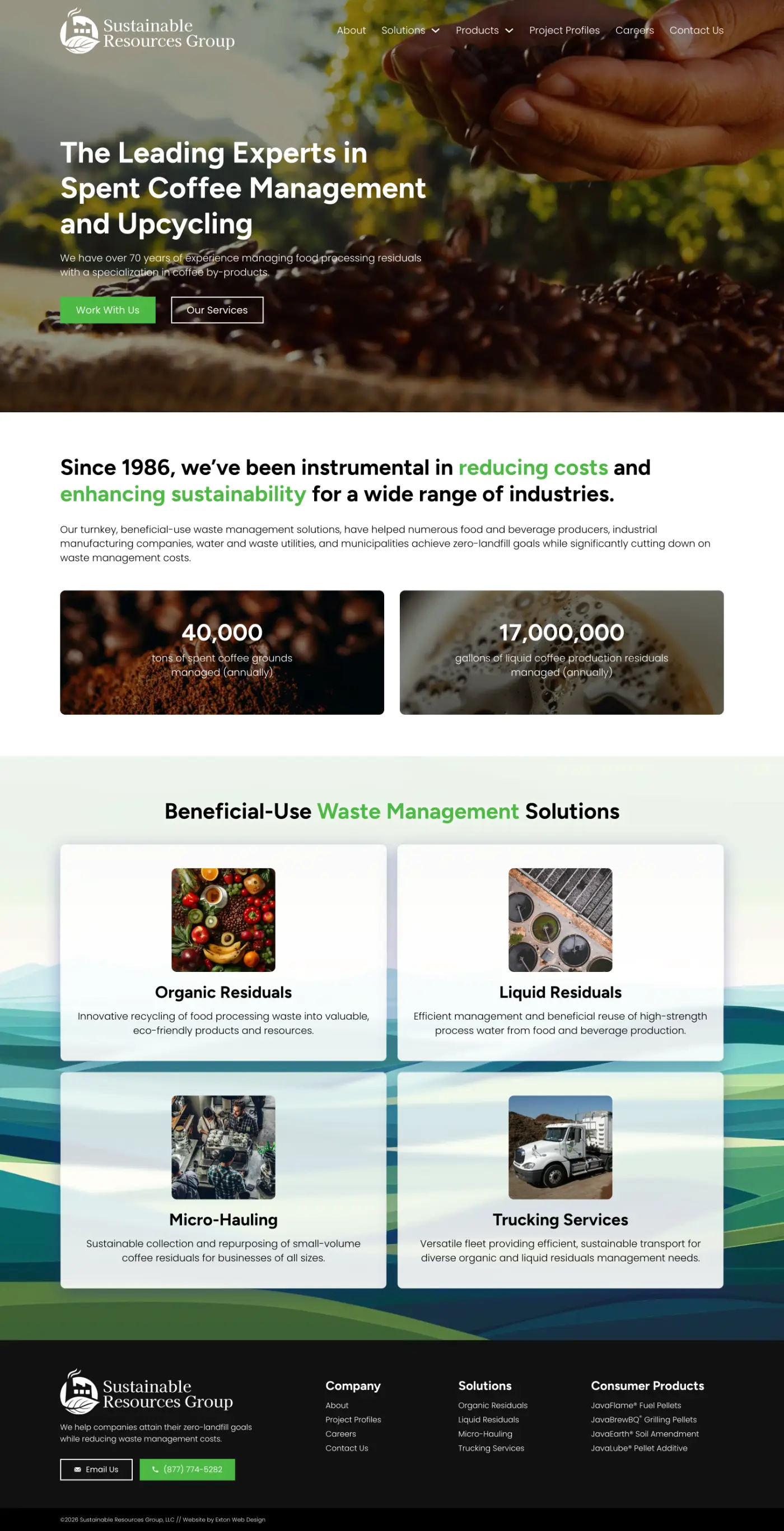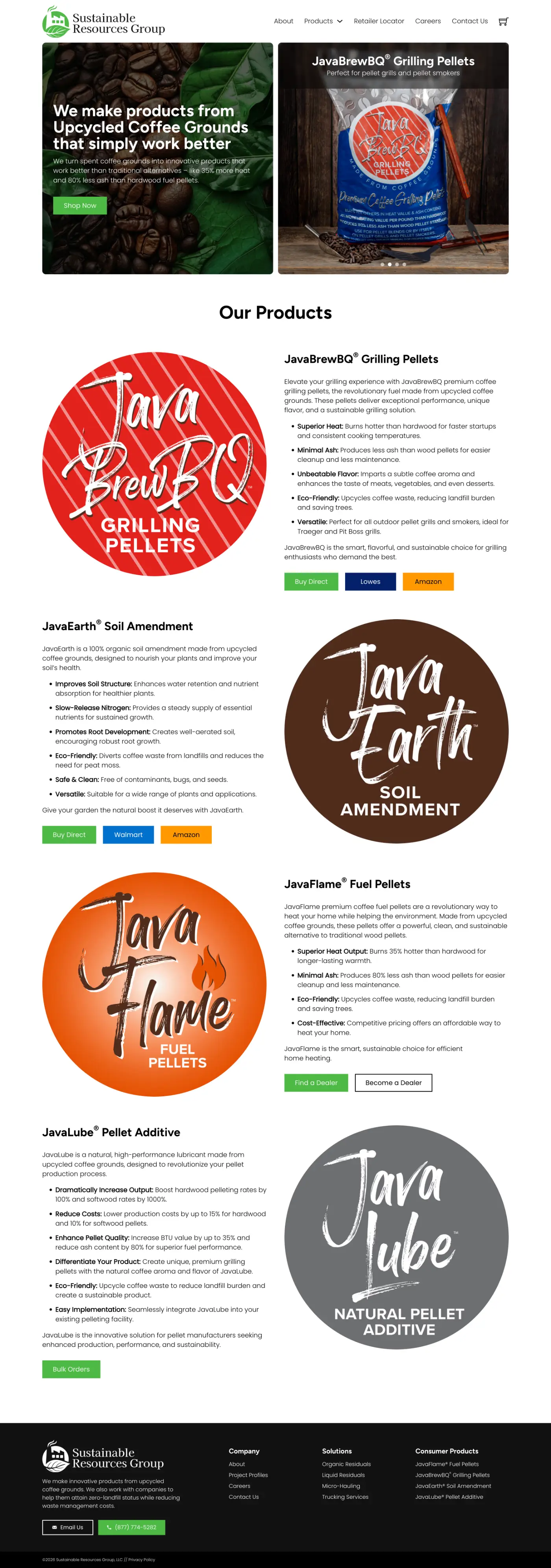 The result is a digital presence that supports both B2B service inquiries and direct-to-consumer product sales while positioning Sustainable Resources Group as the industry leader in spent coffee management.